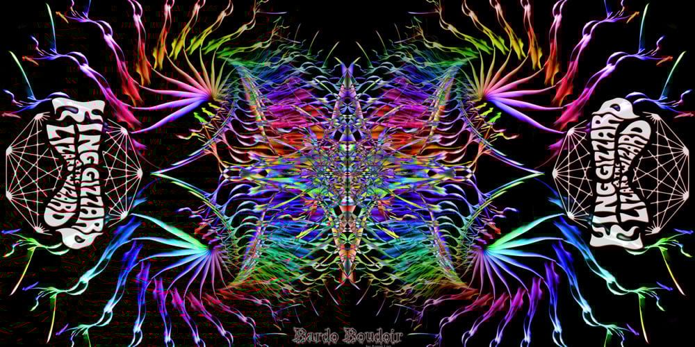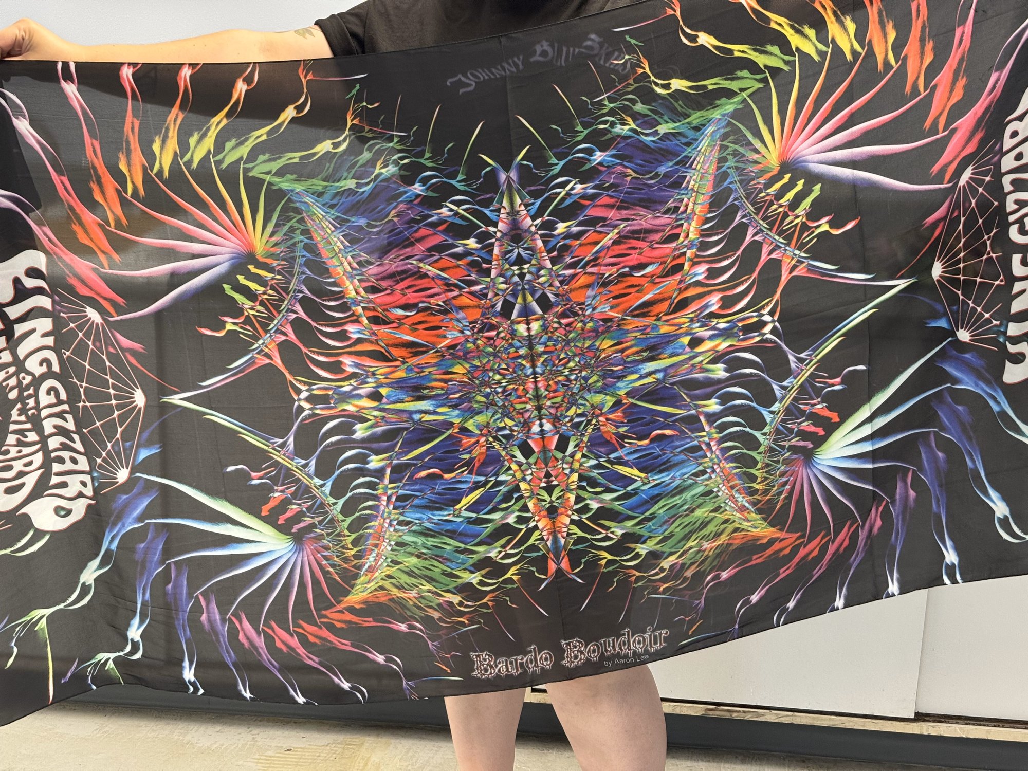 Designed by the visionary artist at Bardo Boudoir in Des Moines, Iowa, this pashmina blends Bardo Boudoir psychedelic art with KG themes.