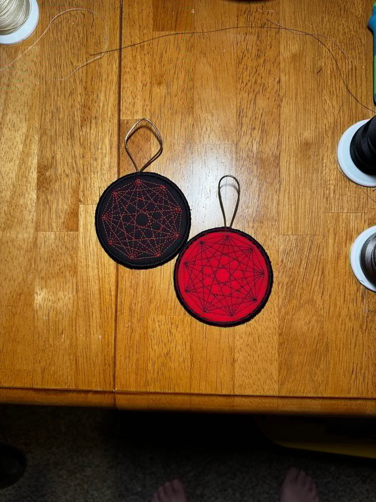 Perfect for the tree or your cars rear view mirror. Double sided embroidered decoration.
