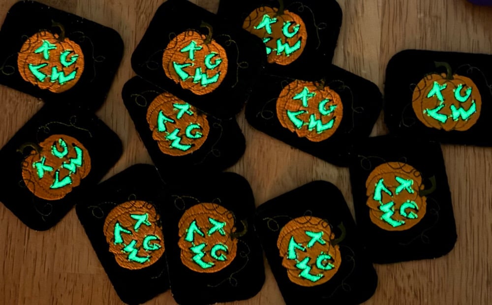 Two variants of this sew-on patch. One with a normal yellow high shine thread and the other with a glow in the dark and blacklight reactive thread.