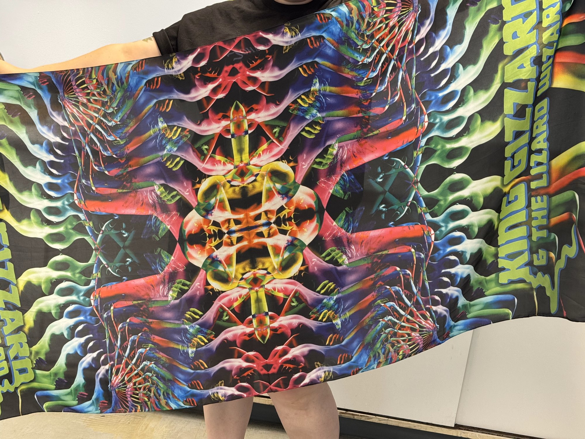 Designed by the visionary artist at Bardo Boudoir in Des Moines, Iowa, this pashmina blends Bardo Boudoir psychedelic art with KG themes.